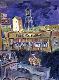 Su estilo pictórico, pese a variar, respeta un patrón de gruesas pinceladas, en las que los colores a menudo no se corresponden con la realidad, al estilo impresionista, representando a menudo escenas de la vida cotidiana, con una intensidad onírica que aporta dramatismo a la acción, como en este Dad’s restaurant, expuesta en la «Drawn Blank Series» en Chemnitz, Alemania.