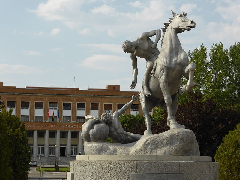 En la plaza principal de la Universidad, encontramos El portador de la antorcha (1954) de Anna Hyatt Huntington. Fue inaugurada en 1955 y ubicada en la Plaza Ramón y Cajal, en frente de Medicina. Una donación a la ciudad de Madrid de la autora y su marido el fundador de la Hispanic Society of America. La estatua de gran simbología muestra a un joven a lomos de un caballo recogiendo una antorcha de manos de un débil anciano que yace en el suelo. Representa la transmisión del conocimiento entre generaciones.