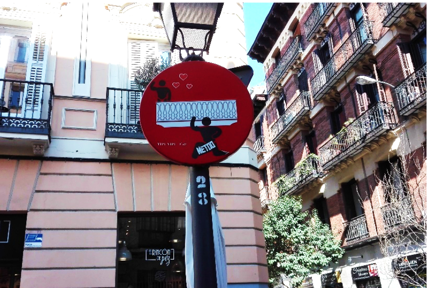 El colectivo Yipi Yipi Yeah (formado por dos artistas madrileños) se ha hecho famoso por sus intervenciones en señales de tráfico. Muchas de ellas se pueden encontrar por las calles de los barrios de Malasaña, Lavapiés o Chueca. Este original soporte ya fue utilizado por el artista Clet Abraham y es, sin duda, un gran ejemplo del juego con el espacio urbano. En algunos casos los mensajes implícitos están unidos a la actualidad, como la escena del balcón donde un hombre cortejaba a otro hombre coincidiendo con el nombramiento de Madrid como sede del World Pride. Lo titularon Romeo y Romeo versión 2.0. Un añadido apareció sobre la señal; otro artista decidió dotarle de un nuevo significado durante el verano de 2018 y añadió una pegatina del “Me too”. Las obras de arte urbano tienen un carácter efímero y los artistas las abandonan a su suerte, siendo plenamente conscientes de que puede que otros artistas realicen intervenciones sobre las ya existentes.