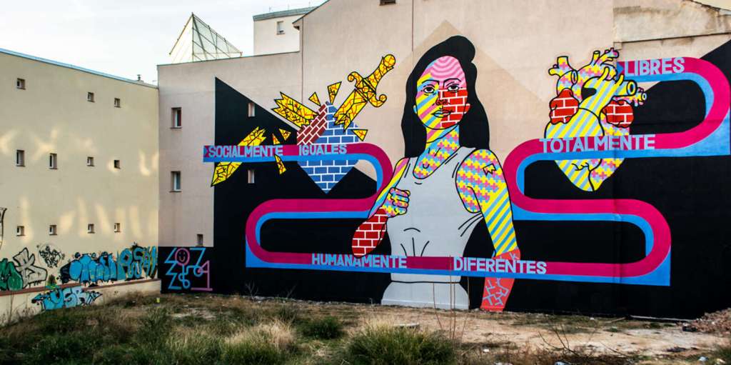 Son numerosas las intervenciones de Ruina que reivindican la igualdad entre hombres y mujeres, pero la más conocida de la ciudad es un enorme mural del barrio de Lavapiés (C/ Embajadores, 16), realizada con su inconfundible estilo pop ácido.