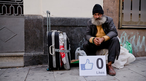 SpY es uno de los pioneros del arte urbano en Madrid. Este artista cuenta con una larga trayectoria y con un claro reconocimiento internacional en el mundo del street art. Una de sus intervenciones mas originales fue la performance llevada a cabo en 2013 con la ayuda de un mendigo que pedía habitualmente dinero en la calle. SpY le pide permiso para poner junto a él un elemento característico de las redes sociales, como es el símbolo de “me gusta”, impreso sobre un cartón pluma. El artista explica en su web que solicitó la ayuda del mendigo para comprobar si la incorporación de tan sencillo elemento generaría algún cambio en el comportamiento de los transeúntes. Así fue. En unas horas no sólo aumentó la atención sino también las donaciones. En la intervención 0 likes, el artista ha utilizado el contexto para buscar la reflexión social a través de la ironía, subvirtiendo el mensaje.
