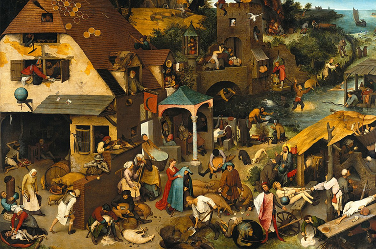 En el cuadro aparece un mundo habitado con las representaciones de un montón de proverbios flamencos renacentistas. La mayoría de ellos hoy han sido olvidados o nunca se tradujeron a otras lenguas.