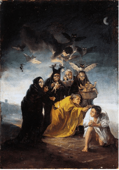Las obras fueron un encargo de los Duques de Osuna para decorar su casa de campo y que cuenta con un total de seis obras. En el primero, un grupo de brujas conjura a un hombre vestido con un camisón blanco que las mira atemorizado. En la segunda obra, el lienzo muestra un ritual de aquelarre, presidido por un macho cabrío, una de las formas que toma el demonio y que tiene en su cabeza unas hojas de vid, emulando la iconografía de Baco. En ambas obras se puede apreciar la imagen popular que se tenía en aquella época de las brujas y como la superstición moldeaba la forma y la opinión con que se veían.