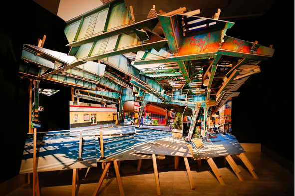 Este «puzzle» de perspectivas compone un trampantojo moderno y fantástico, en el que la decadencia de la ciudad norteamericana se asoma entre el óxido de las vigas del tren.