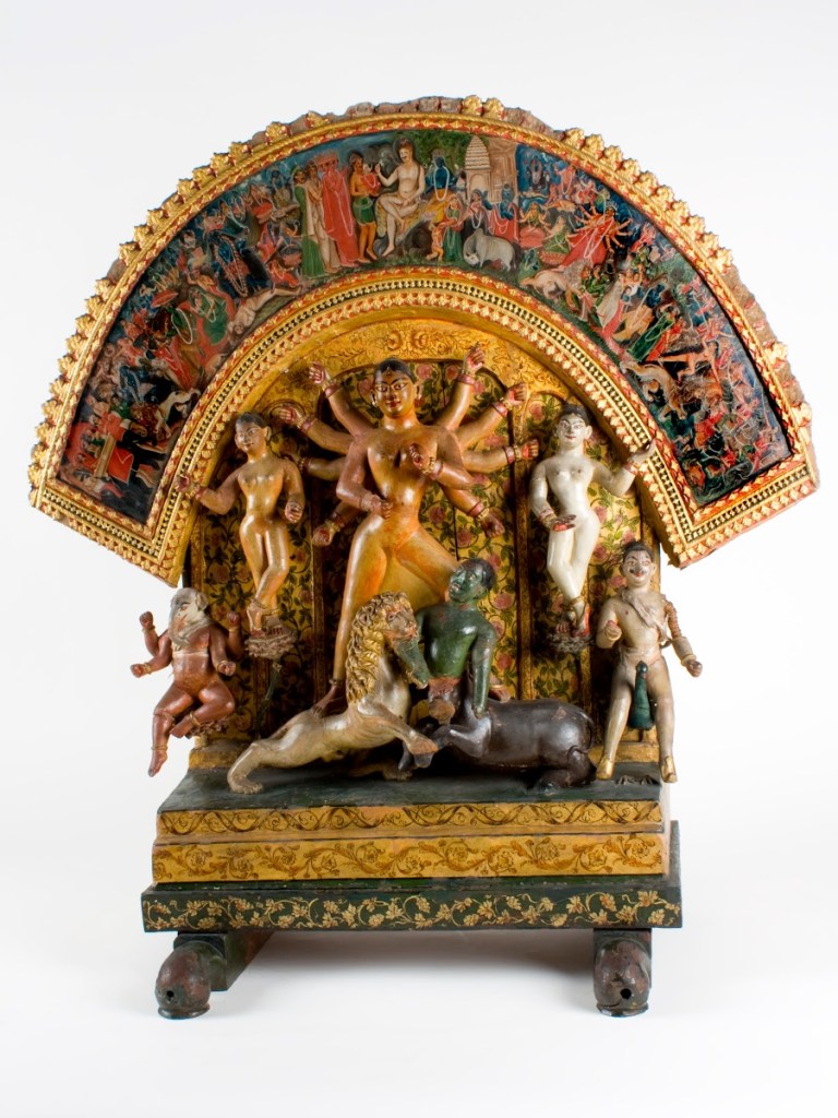 Altar de Durga (Siglo XIX), de Bengala Occidental (India). Realizado con madera policromada, aparece en él la diosa Durga que es una de las encarnaciones de la esposa de Shiva. Aquí se representa el mito en que se enfrenta al demonio búfalo Maisha, que había usurpado el reino de los dioses, a lomos de su león, Shima, y acompañada de sus hijos: Lakshmi, Ganesh, Saraswati y Karttikeya. En el panel superior, se encuentran diversas divinidades presididas por Shiva.