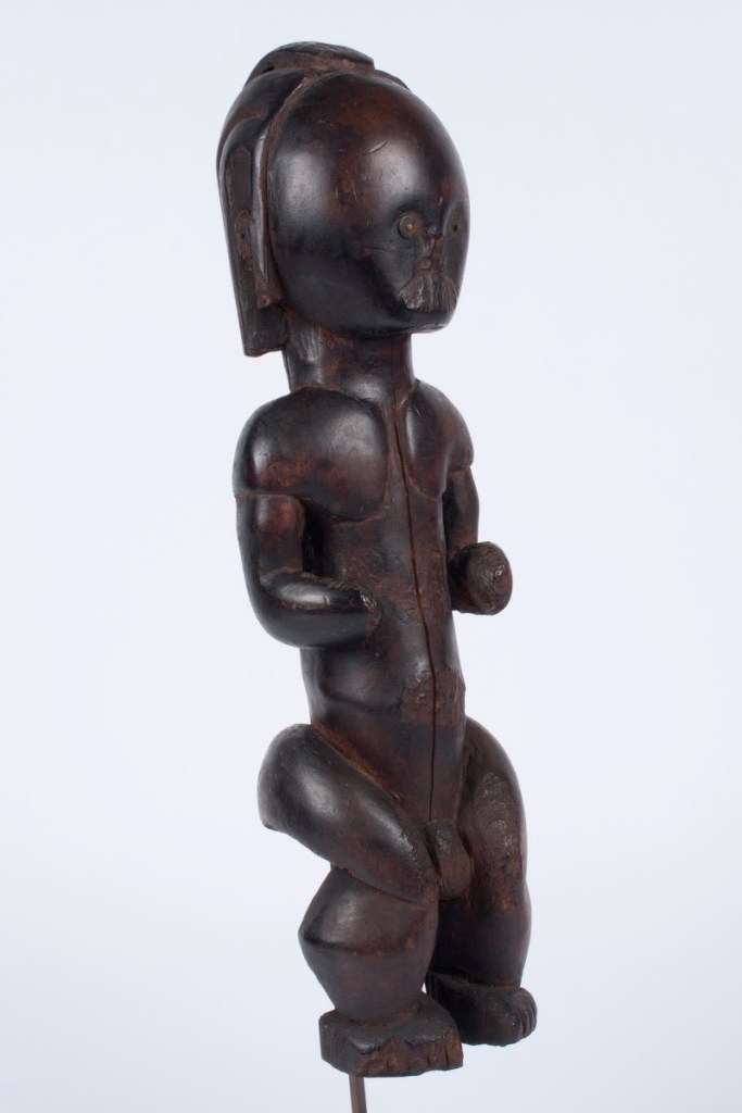 Figura byeri (1830-1870), Guinea Ecuatorial. Estas tallas se insertaban, cubiertas con aceite de palma y mediante un largo apéndice, en una caja que contenía restos óseos de las personas distinguidas y se colocaba en un sitio de honor en el hogar familiar. Periódicamente se llevaba a cabo una ceremonia o rito de paso en honor a ellas en la que se procedía a la iniciación de los jóvenes fang, que así accedían a la condición adulta. En esa ceremonia, los byeris se sujetaban por el apéndice posterior para hacerlos bailar, por lo que llegaron a ser considerados como marionetas en las primeras crónicas occidentales. Las misiones católicas españolas erradicaron el uso de estas figuras en el siglo XX.