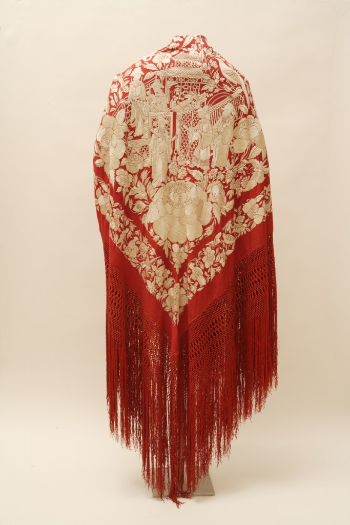 Mantón de Manila (Siglo XIX), China. Realizados con seda, los mantones de Manila se fabricaban en Cantón, una ciudad de la región de China. Desde allí llegaban a Manila para proseguir a través de la ruta del “galeón de Manila” hasta América y Europa, donde se conocían por el nombre de la ruta. Tanto la forma como la decoración de motivos “chinescos” estaban adaptados al gusto occidental, aunque mantuvieran su “sabor” oriental, precisamente porque así se transmitía su valor y su exotismo.