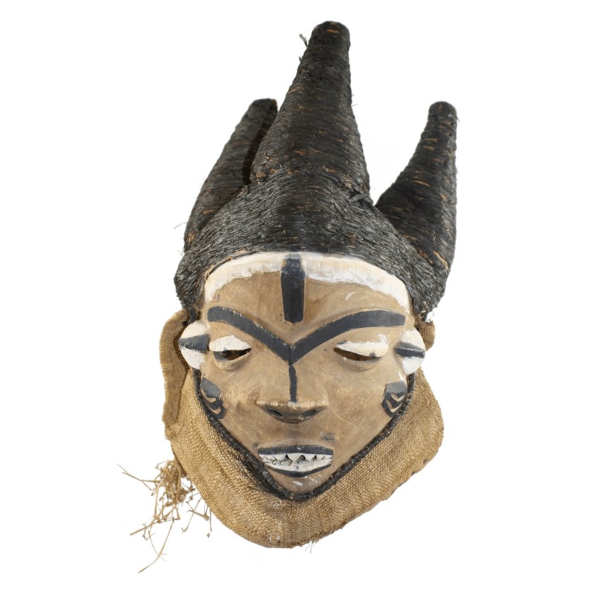 Máscara mbuya (1900-1950), República Democrática del Congo. Este tipo de máscara mbuya se conoce como fumu o “máscara del jefe”. Por eso combina rasgos masculinos y femeninos, ya que un líder debe tener cualidades de ambos géneros para gobernar bien. En la cultura pende, decisión, fuerza y carácter son atributos masculinos asociados al liderazgo. Su contrapartida femenina son: mesura, sosiego y calma. El creador del diseño de las máscaras fumu es el tallista Gabama a Gingungu.