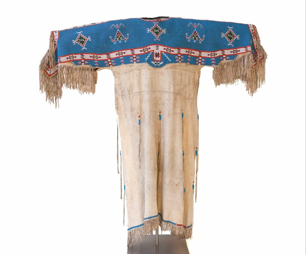 Vestido femenino de la cultura lakota (1900-1923), Estados Unidos. Vestido característico de comienzo del periodo de reservas (1870-1920), cuando se vivió un florecimiento de las artes, ya que prendas como ésta se convirtieron en un modo de resistencia frente a los profundos cambios impuestos y de reafirmación de la identidad cultural. Los triángulos de la parte superior representan tipis, la vivienda tradicional y el diseño central representa el caparazón de una tortuga emergiendo del agua, animal relacionado con la protección de las mujeres.