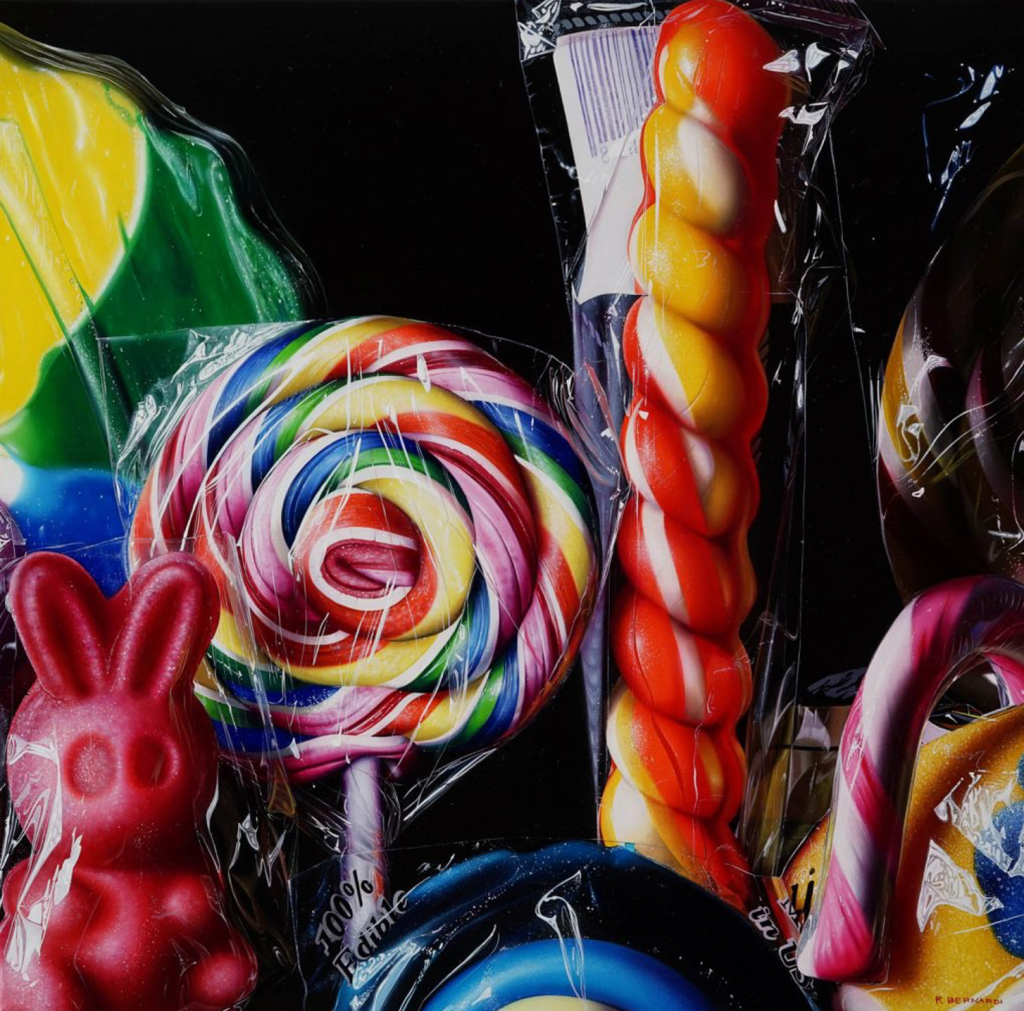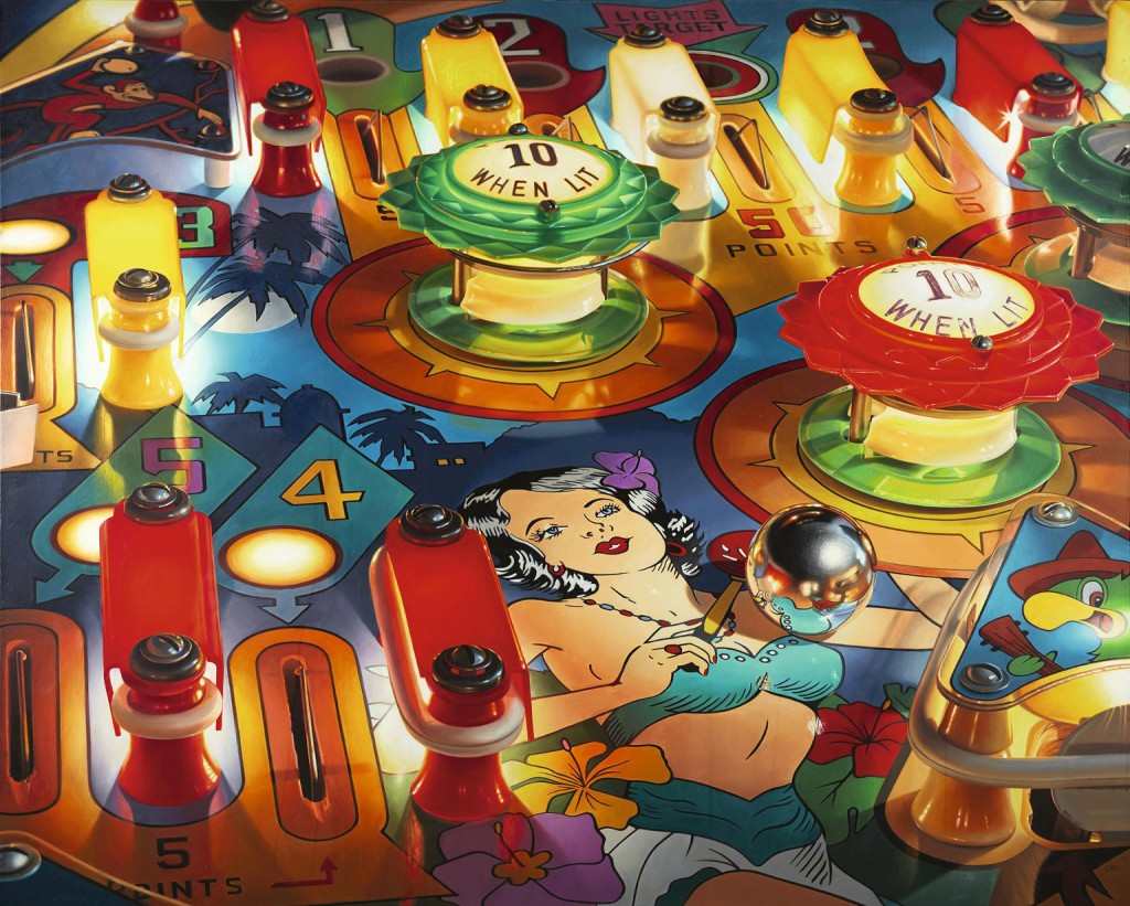 Desarrollado en Estados Unidos y Francia en las décadas de los sesenta y setenta del siglo pasado, este movimiento deriva del fotorrealismo y Pop Art. Consiste en imitar fotografías y llevarlas al máximo detalle, diferenciado de sus antecesores por ser incluso más específico que en el modelo, dejando ver las emociones del autor en el proceso. La pintura de la exposición que muestra estas características de forma ejemplar es Noches Tropicales, de Charles Bell. Gracias a sus colores vivos, la capacidad de las sombras y la representación de una partida de pinball, refleja la sensación de nostalgia y anhelo de su infancia, tema que es constante alrededor de sus obras, expresado a través de máquinas expendedoras, juguetes de hojalata o canicas. Forman parte de las llamadas naturalezas muertas, las cuales referencian de forma dominante al bodegón holandés del siglo XVII y la pintura americana de trampantojo de finales del siglo XIX. Será el principal reclamo y captará la vista del espectador de forma instantánea al entrar en la sala a pesar de no encontrarse en primer lugar.