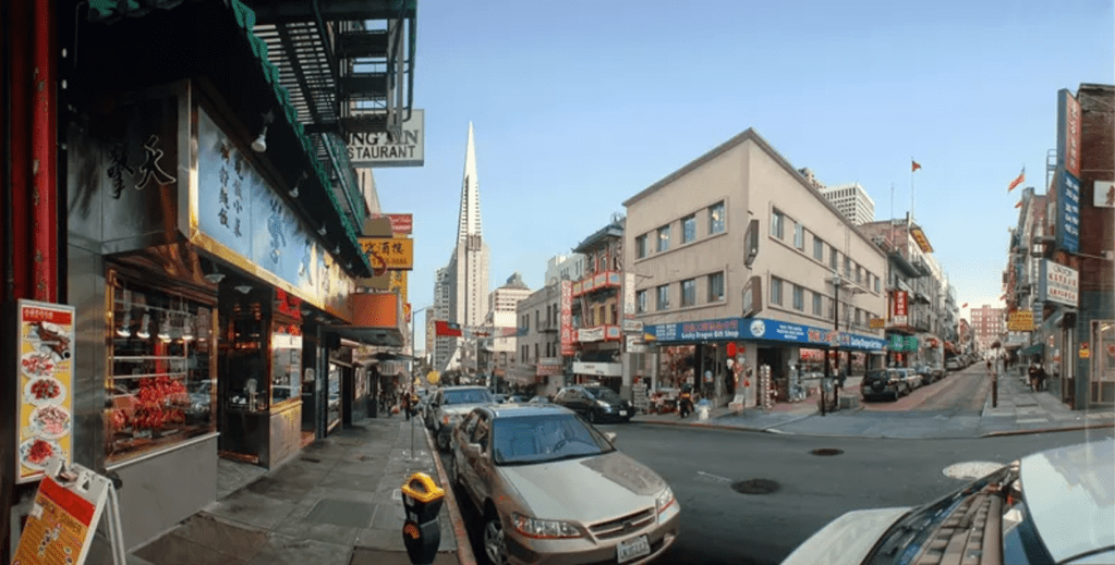 Para terminar la exposición, la sala concluye con dos obras basadas en uno de los temas previamente mencionado, los paisajes. Ambos cuadros utilizan parte de ciudades metropolitanas de Estados Unidos. En primer lugar, Bertrand Meniel, gracias a sus conocimientos de fotografía digital, obtiene en sus pinturas la inclusión de todos aquellos detalles posibles utilizando diversas fotografías como modelo. La exposición contiene Lucky Dragon (2009) un paisaje urbano de la ciudad de San Francisco, en concreto una pequeña esquina del barrio de Chinatown. La escena representada combina la vida diaria, la rutina, lo cotidiano, por medio de las tiendas de los alrededores, con el otro gran elemento de la obra, un hito en la arquitectura moderna e icono de la ciudad, la Pirámide Trasatlántica, que se haya irguiéndose sobre el resto de los edificios.