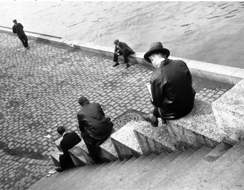 Tres hombres sentados en los escalones junto al Sena, una de sus fotografías más conocidas, se puede encontrar en la primera planta de la exposición y ejemplifica los puntos clave de su estilo. La línea diagonal que forma la escalera divide la composición en dos. Con un punto de vista cenital, se forma una perspectiva vertiginosa. Los hombres sentados son los indudables protagonistas de la foto, encuadrados en el centro. Aun así, no se les ve cara, una decisión consciente que se repite a lo largo de su trabajo. Sentados en un orden simétrico, pasan a ser parte de la arquitectura de la ciudad, como estatuas en el borde de la escalera, integrados con la arquitectura. En el paseo junto al río encontramos otros dos personajes. El primero sentado en el bordillo, mira fijamente al objetivo, observando al observador. El segundo, el guardia, es la única persona en movimiento, pero aun así aparece totalmente congelado. Perfectamente encuadrado en la esquina superior, vigila toda la escena.