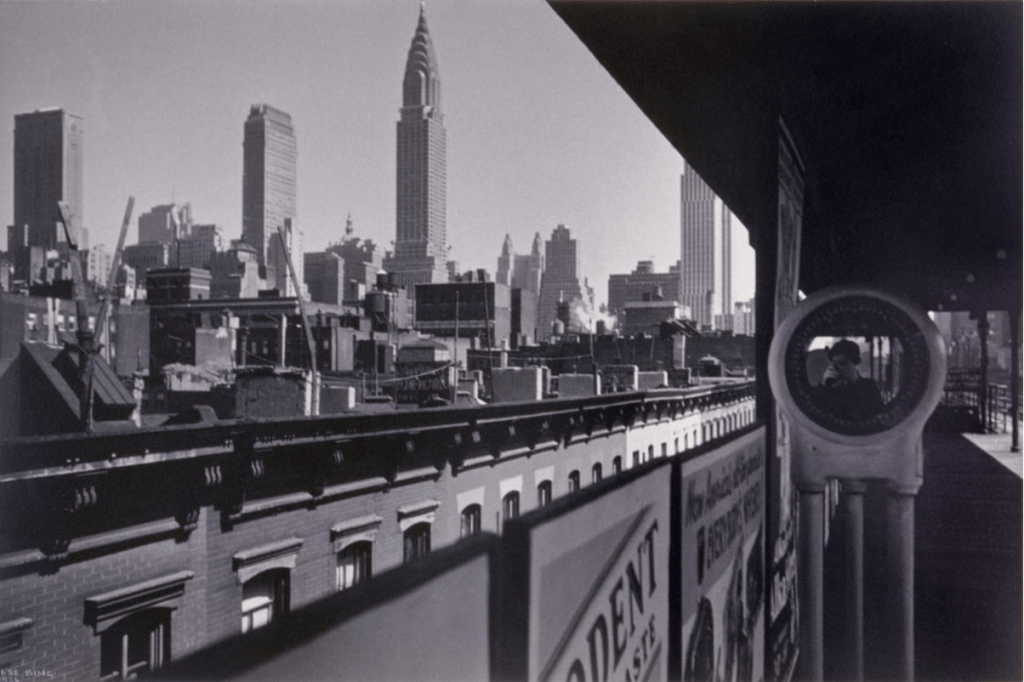 La primera fotografía que nos encontramos es Nueva York – Yo y lo Elevado reúne muchas de las señas de identidad de Bing en una sola imagen. Combina el paisaje urbano, la arquitectura y el autorretrato. Se aprecian las líneas diagonales características que atraviesan la imagen creadas por los carteles publicitarios y por los tejados de los edificios. A la derecha, se alzan imponentes los rascacielos de Nueva York y a la izquierda, se ve a Bing en el reflejo de un pequeño espejo. La integración de la ciudad y las personas es un tema que tratará continuamente.