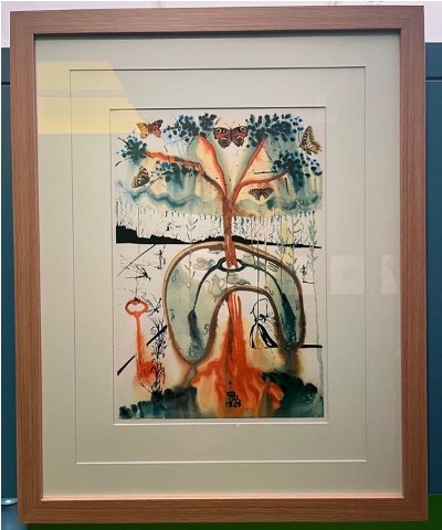 La muestra, cuya comisaria es Helena Alonso, cuenta con setenta y cuatro obras, de las cuales sesenta son grabados y el resto son esculturas, óleos, fotografías y películas. Gran parte de las piezas gira en torno a conceptos como el tiempo, la locura, el sueño, las matemáticas y la propia identidad. Nada más al comenzar a recorrer los pasillos de este fantástico mundo, nos encontramos con las dos películas pioneras de Alicia en el país de las maravillas, la versión de Cecil Hepworth y Precy Stow de 1903, y la de Edwin S. Porter de 1910. Al avanzar por este recorrido, también se puede visualizar el cortometraje de animación llamado Destino, proyecto de apenas seis minutos y medio de duración, en el que colaboraron el cineasta estadounidense Walt Disney y el artista español Salvador Dalí. Dicho corto salió a la luz en 2003, cincuenta y ocho años después del inicio de su producción. El paralelismo entre Alicia y Salvador Dalí es indudable: ambos se mueven entre el mundo de la realidad y el de los sueños. Trece de los grabados de la exposición pertenecen al artista, persona que siempre estuvo fascinada por la metamorfosis y el tiempo. En sus piezas plasma muy bien estos dos temas: la metamorfosis, la cual representa mediante varias mariposas (animales que sufren una de las mayores transformaciones genéticas en su paso de oruga a su estado final); y el paso del tiempo, representado mediante relojes “blandos”, derretidos y detenidos en las seis, indicando la hora del té, como los de La persistencia de la memoria de 1931. Ambos conceptos, el tiempo y la metamorfosis, se pueden apreciar en la siguiente obra, Una merienda de locos (1969). Con tan solo ver esta pieza y sin mirar quién es el autor de la misma, se puede distinguir perfectamente que se trata de una obra de Dalí, debido a la presencia de los elementos ya mencionados.
