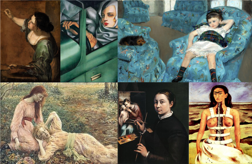 Collage de obras de seis mujeres que cambiaron la historia del arte. Sus nombres en orden de aparición de sus obras : Artemisia Gentileschi, Tamara de Lempicka, Mary Stevenson Cassatt, Louise Catherine Breslau, Sofonisba Anguissola y Frida Kahlo.