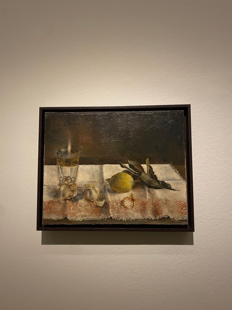 En esta sala los lienzos son más oscuras y vemos un claro precedente de lo que serán sus producciones futuras como en Lamparilla (1956). En este caso, es un bodegón que ya podía tener en este caso uno de sus representativos vasos de la marca Dura Lex o el aceite de La Española o la mermelada Helios, que recuerda al emergente Pop Art y las influencias por parte de la publicidad o el estado del bienestar propio de la años sesentas. Destaca el uso de la luz y se aprecia su paso por Italia con su marido Francisco López, premiado con una beca para estudiar allí. Pudo visitar los cuadros del Renacimiento o Barroco italiano y estudiar el juego de la luz y cómo esta impacta en los objetos.