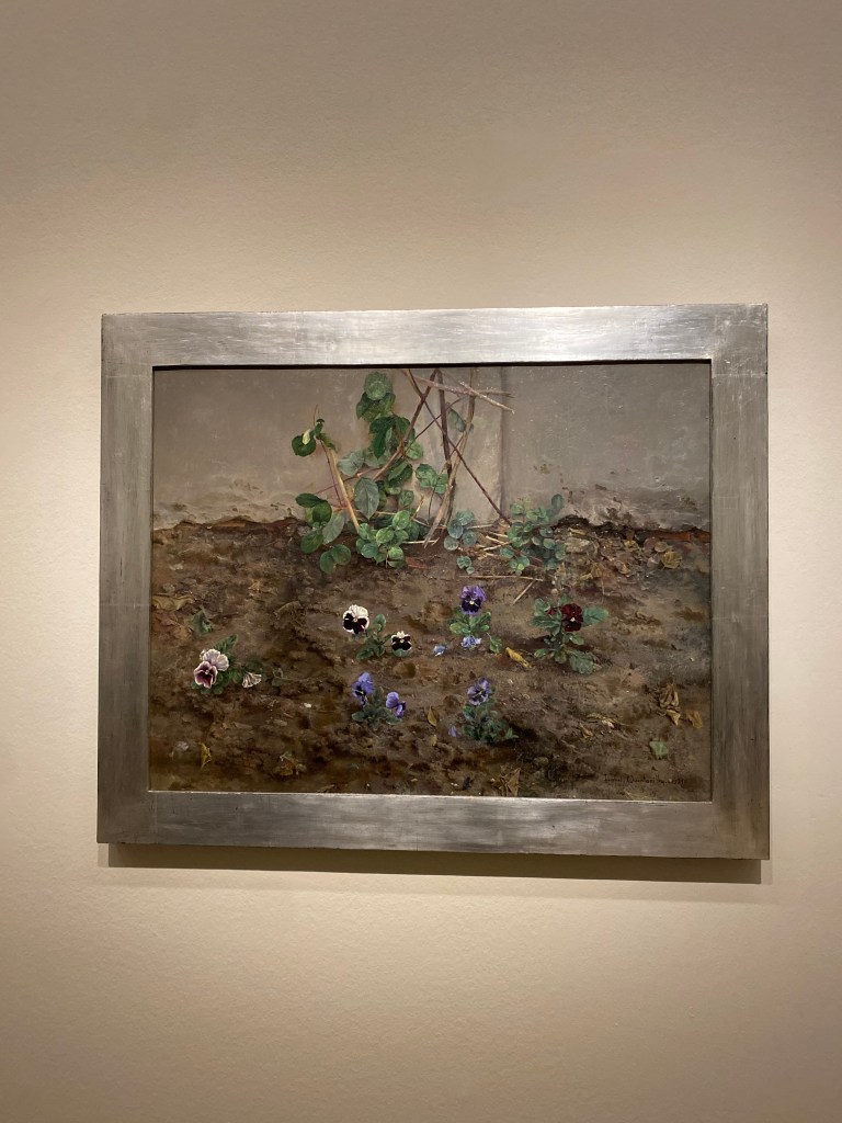 En “Hortus conclusus” el papel protagonista recae sobre las flores y plantas que Quintanilla cultivaba, como hortensias o pensamientos y jardines que decora con los frescos observados en su visita a Pompeya y en las villas clásicas romanas durante su estancia en Italia.
