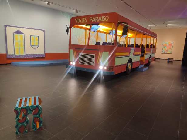 Una de las obras que más llama la atención es “El Autobús”, una instalación de gran tamaño en la que, a través de murales pintados in situ, se recrea la forma de un autobús. En el interior, una serie de pantallas y una voz en off guía al espectador a través de un viaje ficticio, sin un destino concreto. Dos realidades chocan según el punto de vista y la experiencia de cada persona. Por un lado, retrotrae a los largos viajes en autobús en países como México o Argentina; por otro, y desde la óptica de un turista, juega con las expectativas acerca del lugar visitado, exótico y desconocido. Se trata de una instalación que ya fue presentada en el Tate de Liverpool en 2019 y en el Museo Kiasma de Helsinki en 2022.