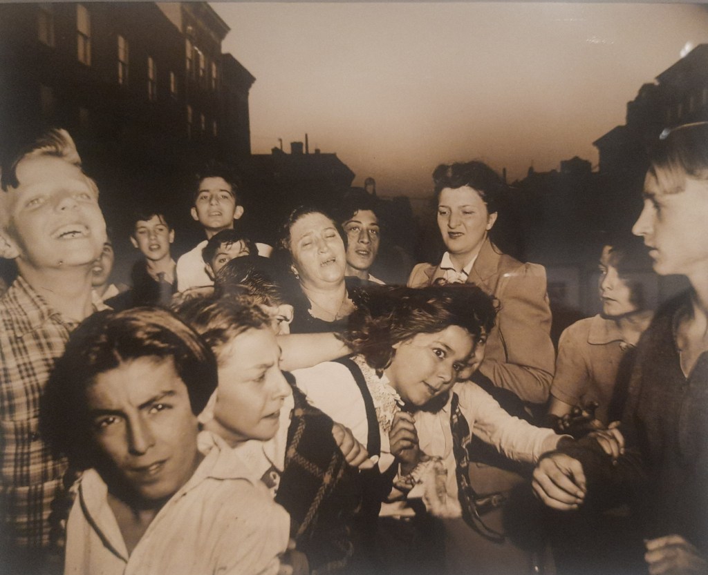 Weegee, Colegiales de Brooklyn mirando a un jugador asesinado en la calle, 1941