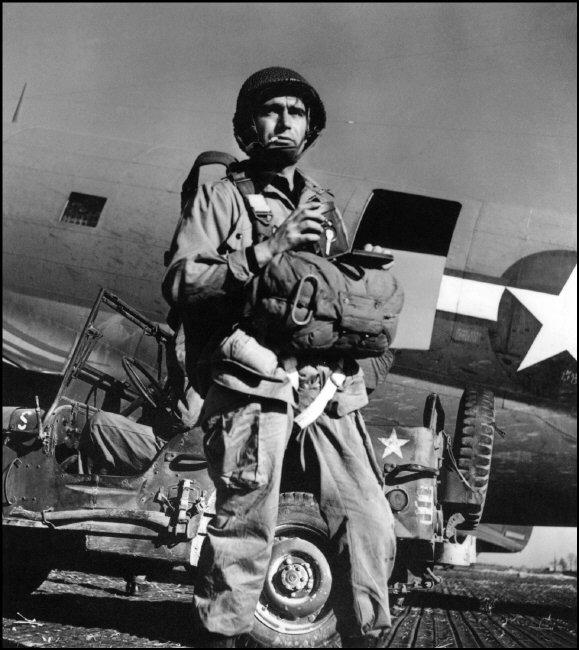 Robert Capa antes de lanzarse en paracaídas sobre Alemania con las fuerzas estadounidenses, Arras, Francia, 23 marzo de 1945. Fuente: Robert Capa Icons