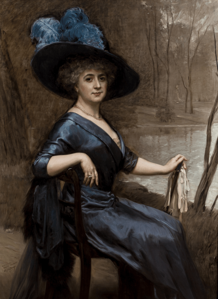 Otra de las piezas destacadas es Clarita Seminario 1911, donde vemos a Clara Hahn, hermana menor de María. La segunda esposa de Raimundo de Madrazo fue conocida como Clarita Seminario por su matrimonio con el político ecuatoriano Miguel Seminario. La pintura la muestra con un elegante traje de seda azul y apoyando su mano izquierda sobre un bastón del que penden unos guantes blancos. Posa ante un fondo de árboles deshojados y un estanque, posiblemente en el bosque de Saint-Germain-en-Laye, donde el matrimonio Seminario poseía una residencia. Este lienzo es ejemplo de la reducción de la gama cromática, la pincelada fluida y el mayor abocetamiento que adquieren los retratos del pintor en la etapa final de su vida.