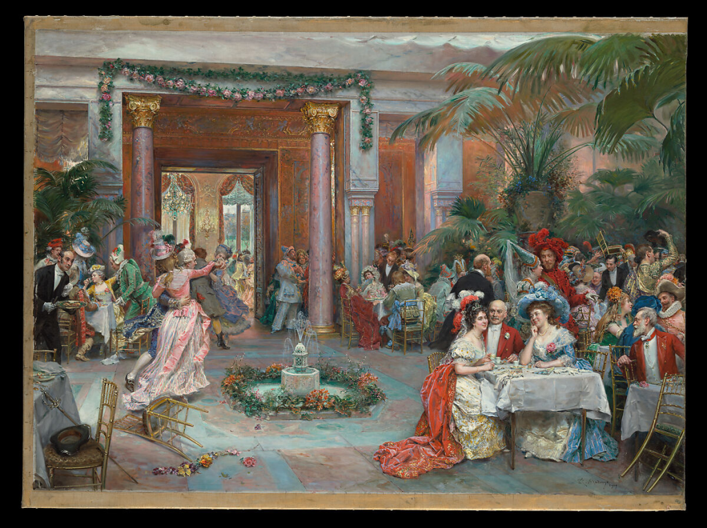 La exposición madrileña propone un recorrido riguroso por su vida y su obra, desde los inicios académicos hasta la madurez serena de sus últimos años. A través de las salas se percibe cómo el artista fue encontrando su voz en el París del Segundo Imperio, ese hervidero cultural donde convivían las tradiciones académicas con las nuevas corrientes impresionistas. Madrazo se instaló allí en 1862 y, tras abandonar los grandes temas históricos, comenzó a pintar escenas cotidianas de una belleza minuciosa: mujeres en salones luminosos, interiores cargados de tapices, porcelanas y sedas, personajes elegantes que parecen vivir suspendidos en un instante de armonía. Era el gusto del nuevo público burgués, ávido de imágenes que destilaran refinamiento y éxito social.
