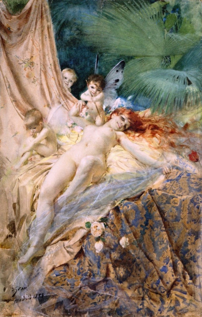Entre las obras realizadas en esta etapa destaca La ninfa del amor, un raro ejemplo de temática mitológica dentro de su producción. La pieza marca un punto de inflexión, ya que a partir de entonces Zorn orientará de manera más decidida su pintura hacia escenas de la vida contemporánea y entornos cotidianos, alejándose progresivamente de los argumentos alegóricos. Este giro coincide con su madurez artística y con una mayor seguridad en el uso del óleo, visible en obras como Placer de verano, pintada en St Ives, donde el estudio de la luz sobre el agua y la captación del instante crean una perfecta síntesis entre naturalismo y modernidad.