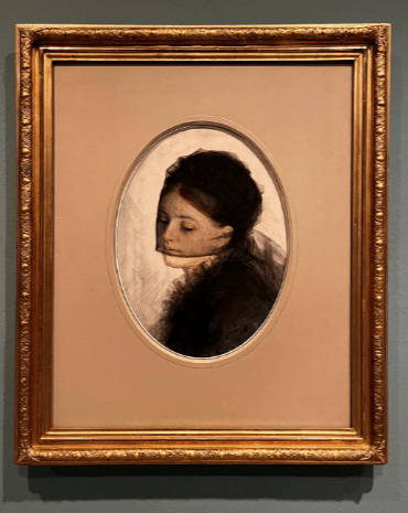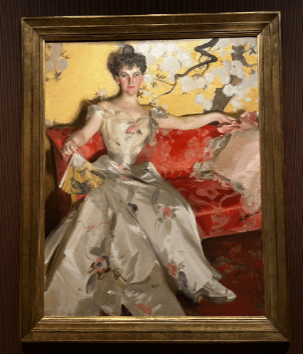 En el retrato de Elizabeth Sherman Cameron se advierte, además, la influencia del japonismo y del Art Nouveau, visibles en la estilización de la figura, la economía compositiva y el tratamiento decorativo del fondo. La modelo aparece con una expresión firme y contenida, casi desafiante, que refuerza su presencia autónoma dentro del encuadre. Zorn construye una imagen en equilibrio entre modernidad formal y sofisticación social, donde la armonía de líneas y volúmenes dialoga con una actitud que proyecta seguridad y carácter.