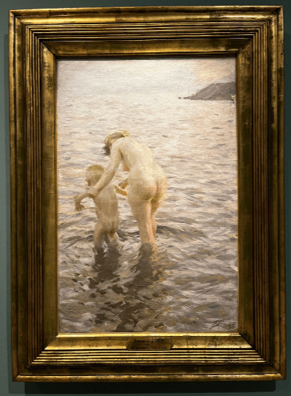Todos los paisajes que se ven en estos cuadros son de Dalarö, la casa que Zorn y su esposa alquilaban para veranear en el archipiélago cercano a Estocolmo. En este entorno natural, el agua, la luz y el cuerpo femenino se convierten en los ejes centrales de su investigación pictórica. Obras como La primera vez (Con mamá) muestran un estudio minucioso de los reflejos sobre la superficie del agua y sobre la piel, donde la pincelada suelta captura el instante con una sensación de inmediatez casi fotográfica.