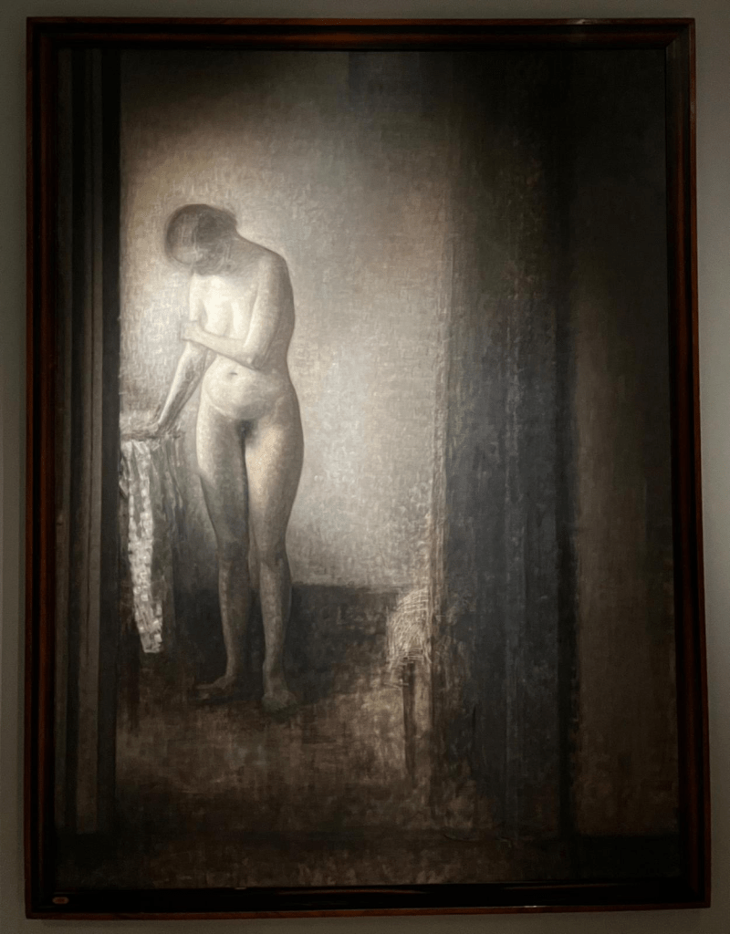 Tras abandonar el apartamento de Strandgade 30, que había constituido su principal motivo artístico, y trasladarse a Strandgade 25, Vilhelm Hammershøi retoma el estudio de la figura humana en grandes formatos. Lo hace a través de desnudos a tamaño natural, situados en depurados y fríos marcos arquitectónicos o en composiciones más íntimas, donde explora una representación más dinámica del cuerpo.