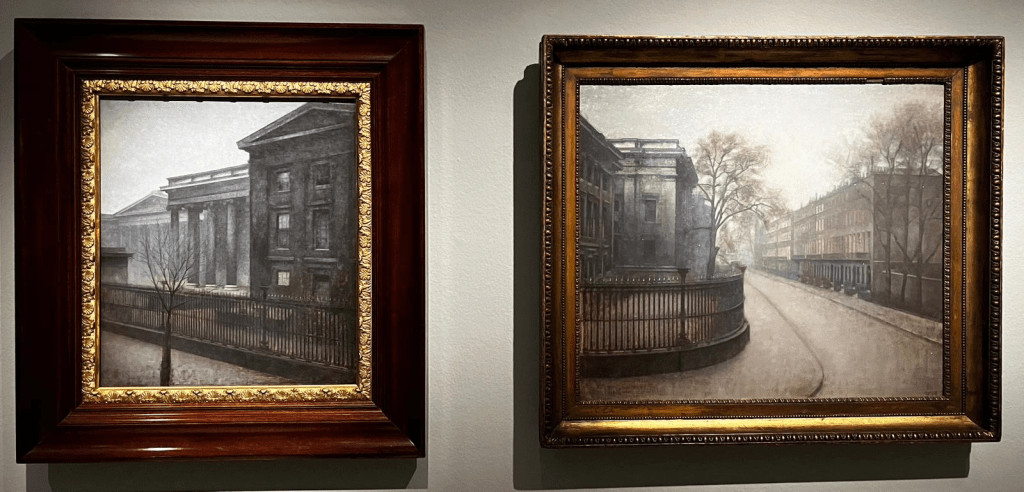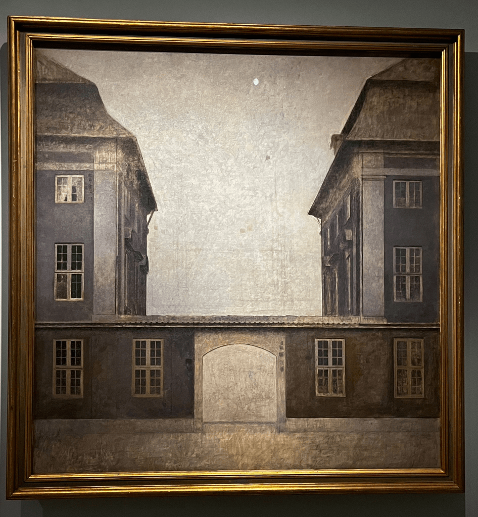 Los paisajes son tratados de un modo similar a sus composiciones interiores, como escenas suspendidas en el tiempo. Tanto en Copenhague como en Londres, destacan las vistas y sus edificios históricos, representados vacíos y desde puntos de vista elevados.